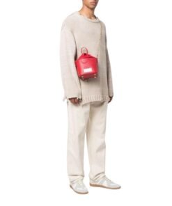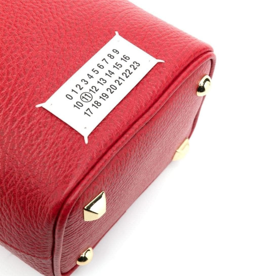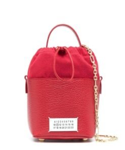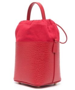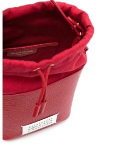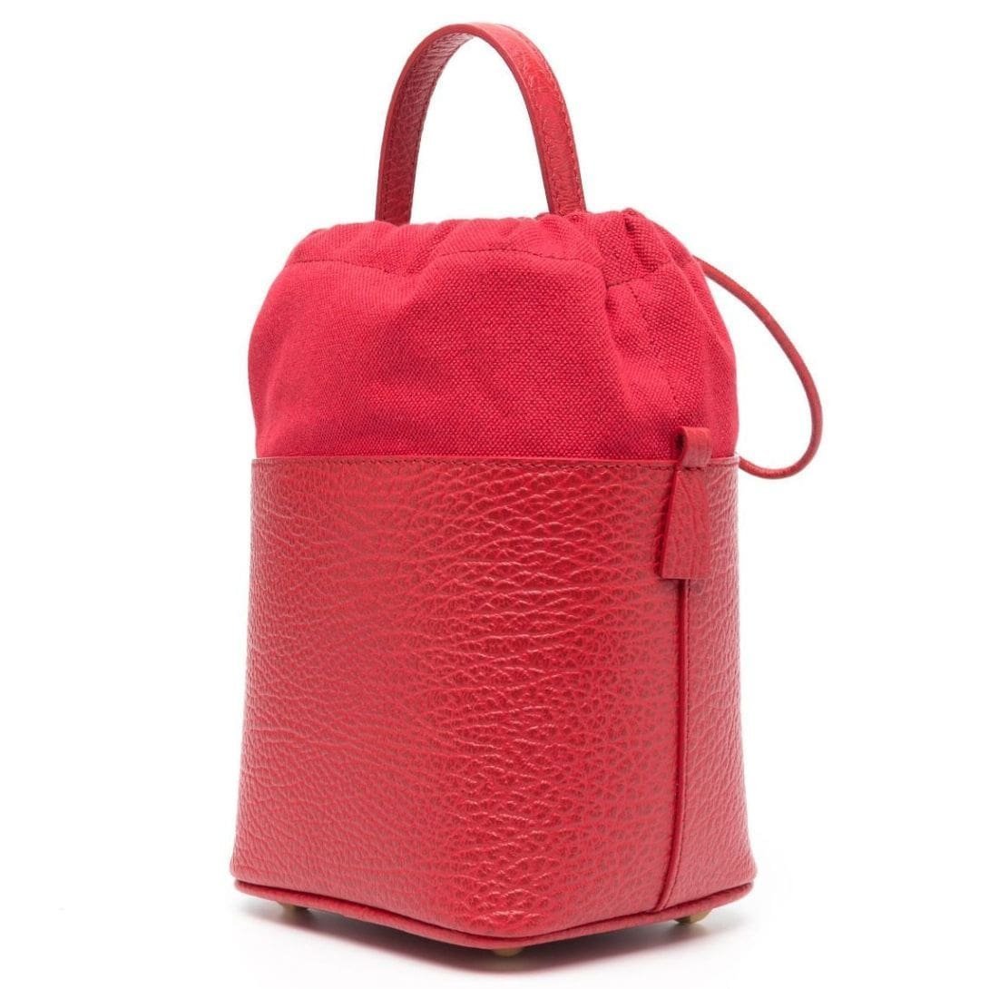 Crafted in Italy, Maison Margiela small 5AC leather bucket bag, a striking accessory that combines style with practicality. Presented in a vibrant poppy red hue, this bag is crafted from a luxurious blend of calf leather and cotton, offering both durability and elegance.