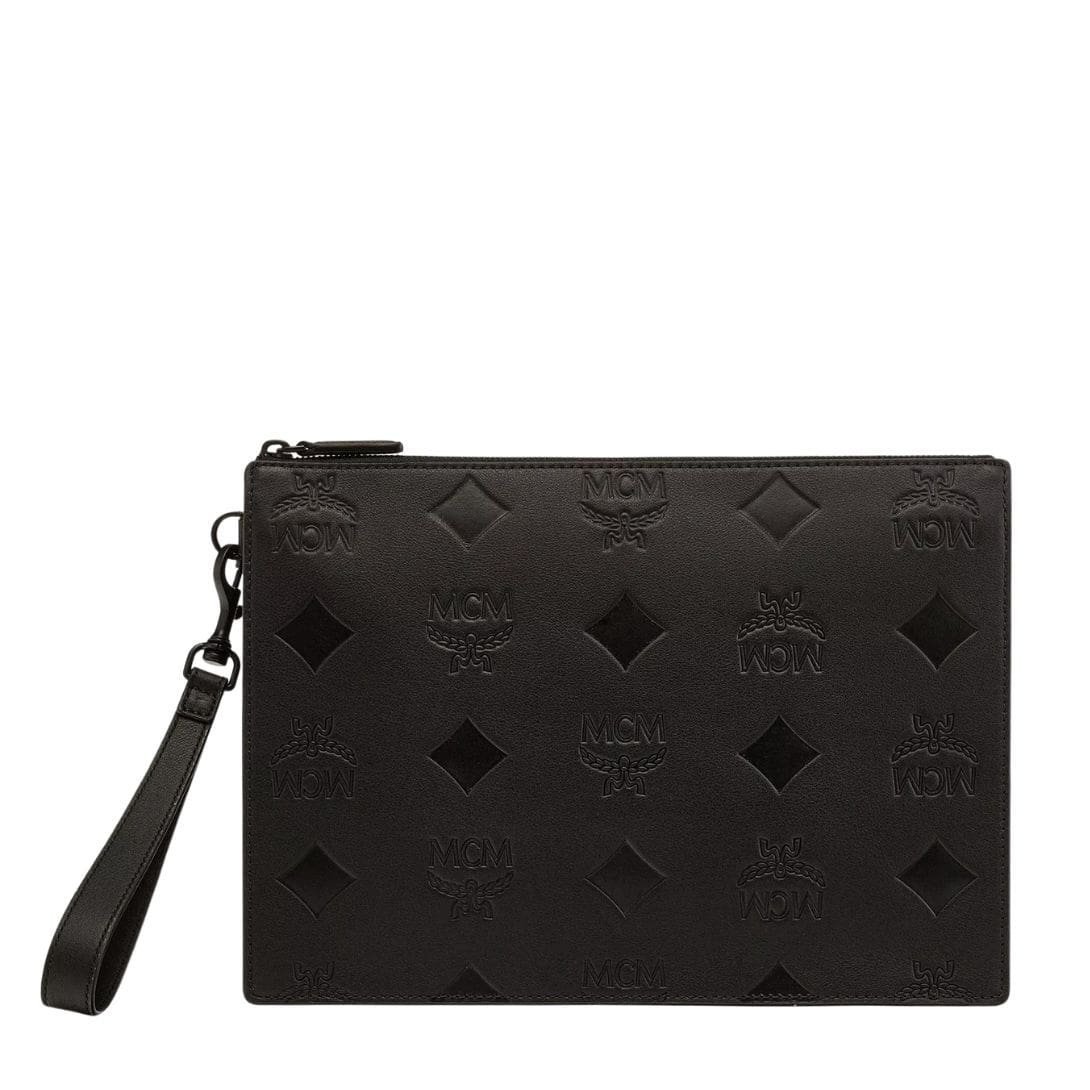 MCM AREN WRISTLET ZIP POUCH IN MAXI MONOGRAM LEATHER BLACK
