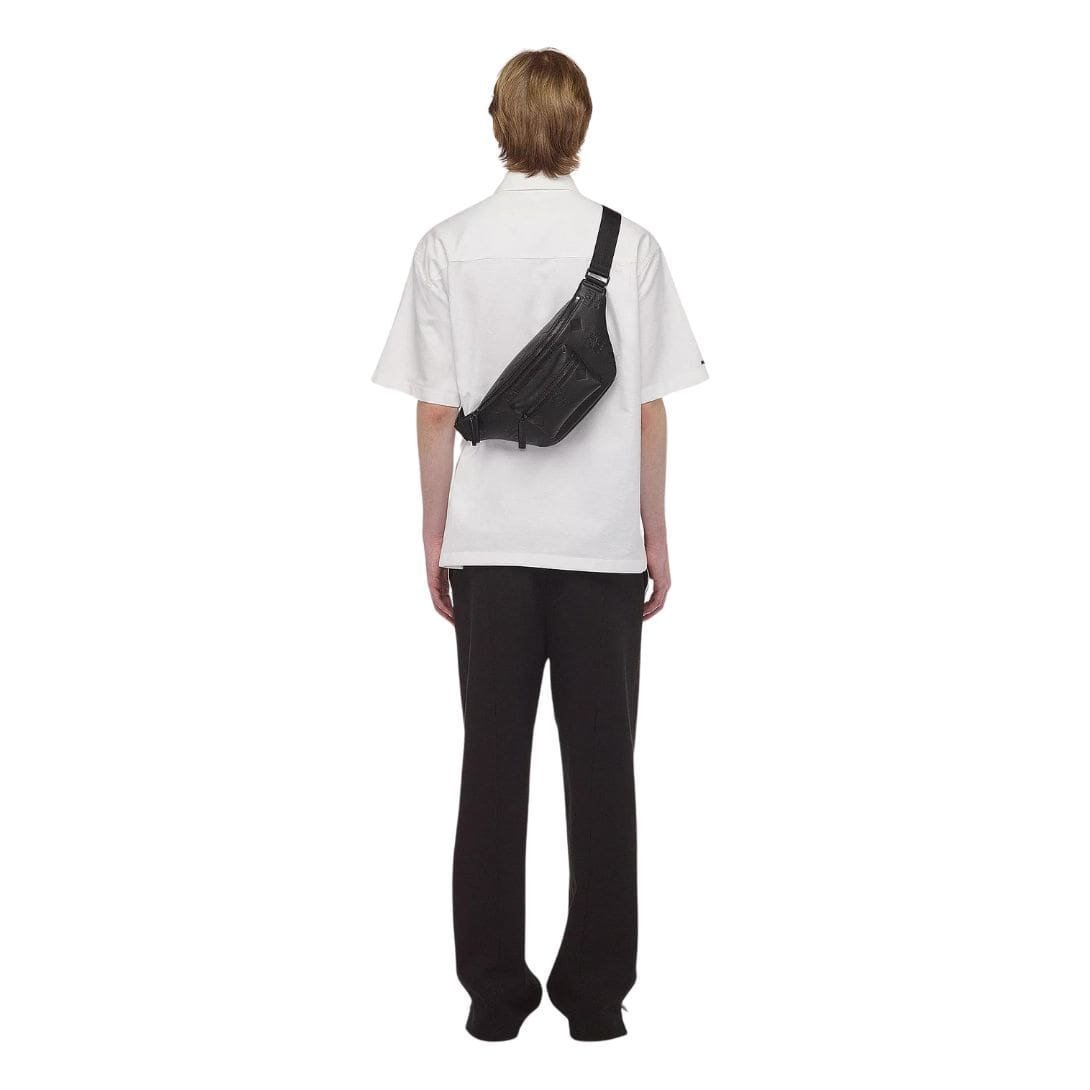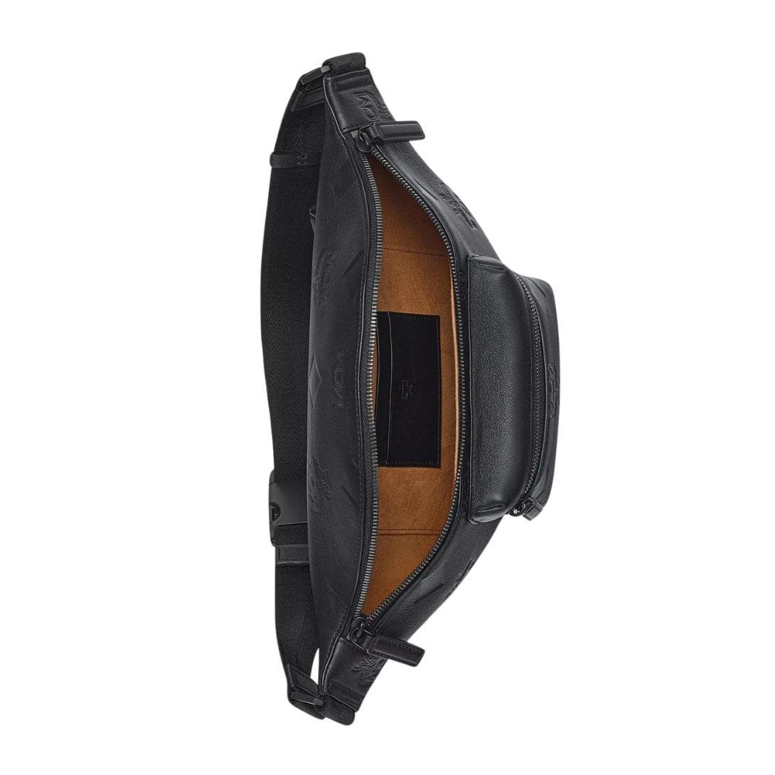 The MCM Medium Fursten Belt Bag In Maxi Monogram Leather Black. by MCM embodies the pinnacle of the brand’s renowned craftsmanship, featuring an exquisitely upscaled rendition of their iconic Visetos monogram. Crafted with precision and attention to detail, this belt bag serves as a mobile testament to MCM’s commitment to luxury and sophistication.