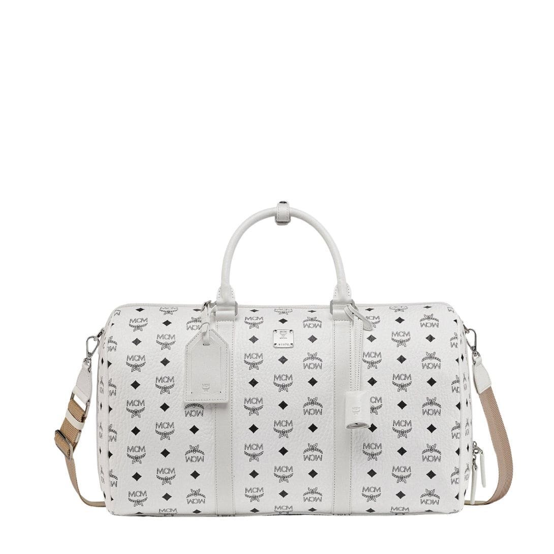 The medium Ottomar Weekender bag from MCM Ottomar Weekender Bag In Visetos White. is not just a travel accessory; it’s a statement of enduring style and practical luxury. Crafted meticulously from white Visetos monogram canvas and supple nappa leather, this bag embodies sophistication and functionality in equal measure.