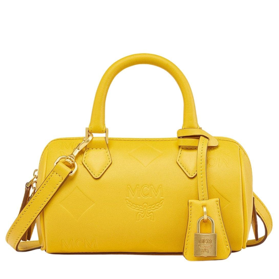 Indulge in the timeless allure of MCM small Ella Boston bag in maxi monogram leather yellow|old gold, a refined masterpiece meticulously crafted from natural Nappa leather, adorned with the iconic Maxi monogram. Evoking the opulence of Munich’s Golden Age, this compact yet capacious carryall is a testament to both style and functionality.