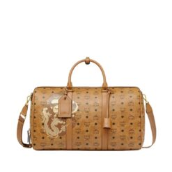 Introducing the MCM X BAPE Ottomar Weekender Bag In Visetos Cognac, a luxurious travel companion that merges high fashion with streetwear flair. This exceptional piece is adorned with gold-tone BAPE® motifs, paying tribute to the Year of the Dragon. The legendary zodiac sign is showcased alongside the iconic APE HEAD on the front of the silhouette, creating a striking and meaningful design.