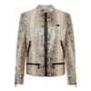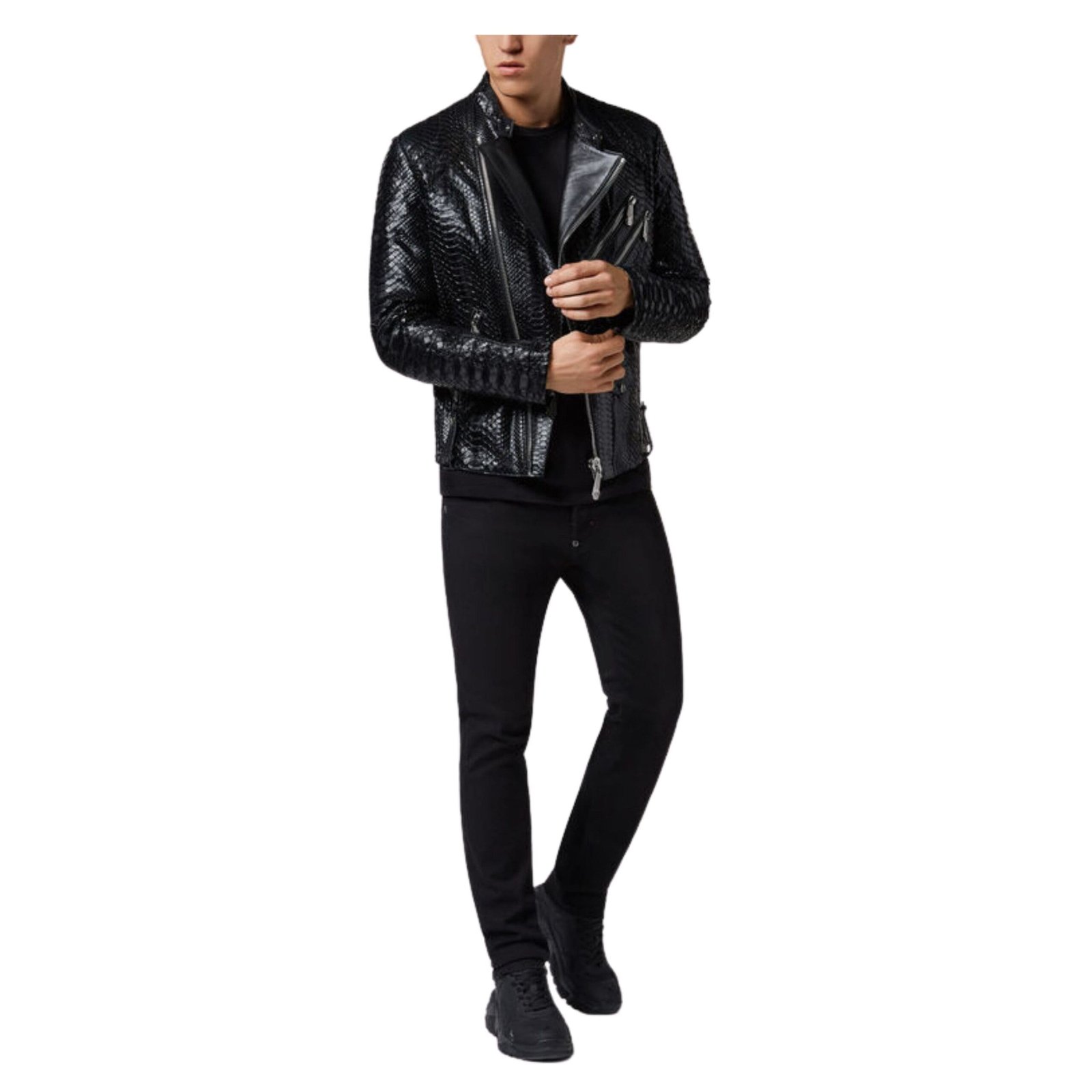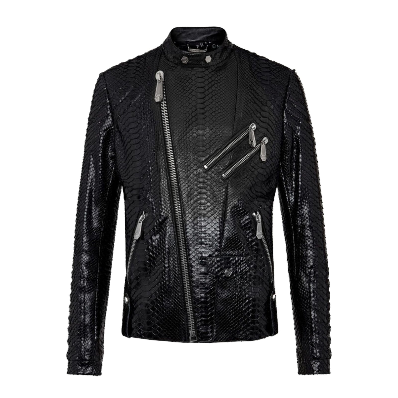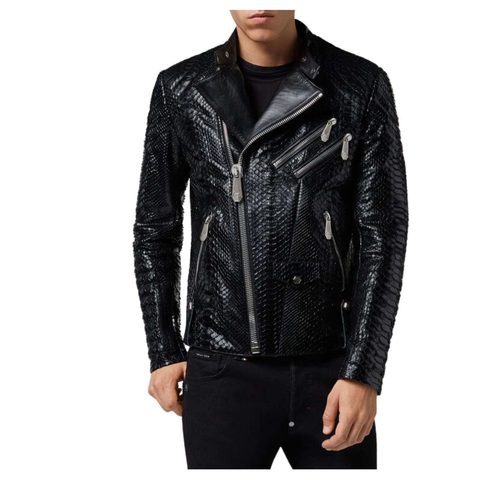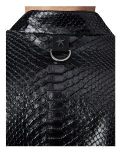 Reinterpreting an iconic piece of clothing is no small feat, yet Philipp Plein effortlessly achieves this with his signature blend of contemporary flair and unconventional design. Take, for instance, this stunning leather jacket, or “perfecto,” meticulously crafted from polished python skin—an embodiment of luxury and sophistication.