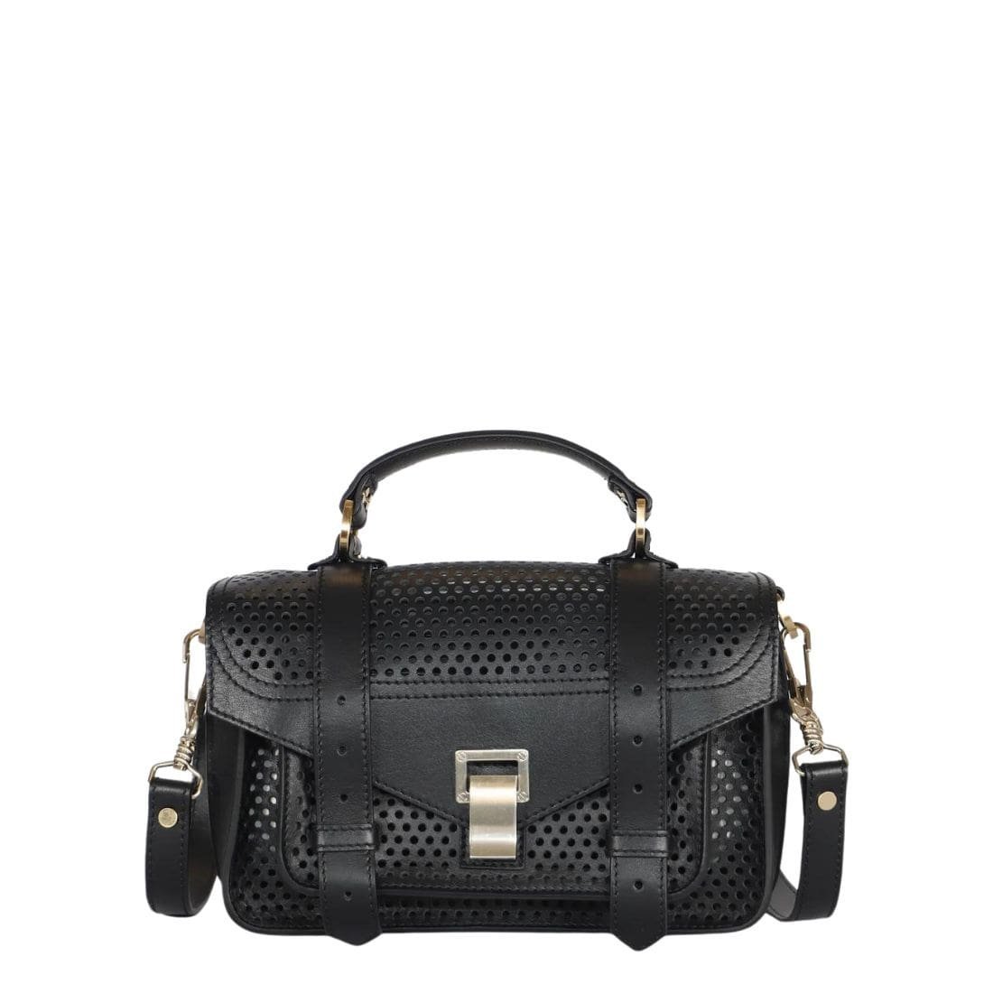 Accentuating the bag’s allure is the silver-tone metal hardware, which adds a contemporary edge and complements the sleek black perforated leather with a subtle shimmer. Crafted with meticulous attention to detail, the PS1 Tiny Bag epitomizes Proenza Schouler’s commitment to superior craftsmanship and quality. Made from 100% calfskin leather, it promises both durability and sophistication, making it a standout accessory for the modern fashion enthusiast.