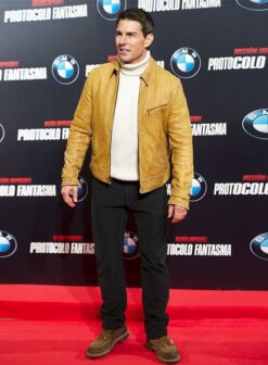 Customization options abound, allowing you to tailor the jacket to your exact measurements or choose from our Ready Sizing options for a perfect fit. From selecting the color to fine-tuning the details, you have the freedom to personalize the jacket to suit your individual style preferences.Tom Cruise Mission Impossible 4 premiere leather jacket iconic style.