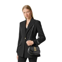 At the heart of its design is the iconic Greca motif, a signature element of Versace’s heritage, subtly integrated into the bag’s structure. This motif is intricately embossed along the edges, providing a refined yet bold statement. The gold-tone hardware complements the deep color of the leather, adding a touch of glamour and sophistication. The centerpiece of this exquisite bag is the Medusa head, an emblem synonymous with the Versace brand, prominently displayed on the front flap, further emphasizing its luxurious pedigree.