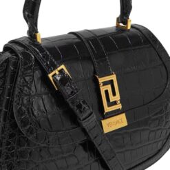 At first glance, the bag captivates with its luxurious croc-effect leather, meticulously embossed to mimic the texture of genuine crocodile skin. The rich, lustrous surface exudes an air of prestige and refinement, showcasing Versace’s commitment to superior craftsmanship.