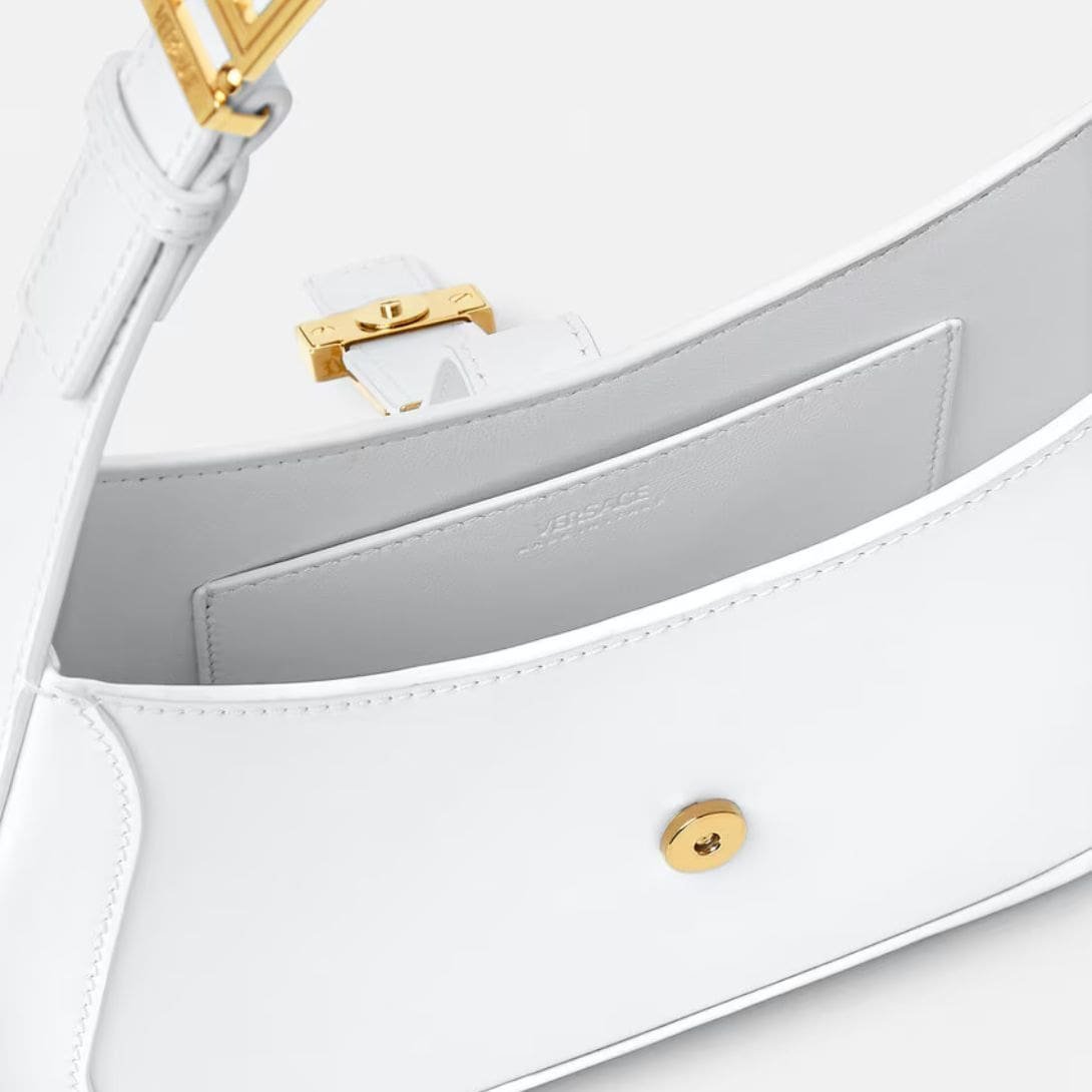 At first glance, the bag captivates with its sleek silhouette, boasting smooth lines and a compact yet spacious design ideal for the modern woman on the go. The lustrous leather exterior, available in a range of rich hues, showcases the timeless elegance synonymous with Versace.